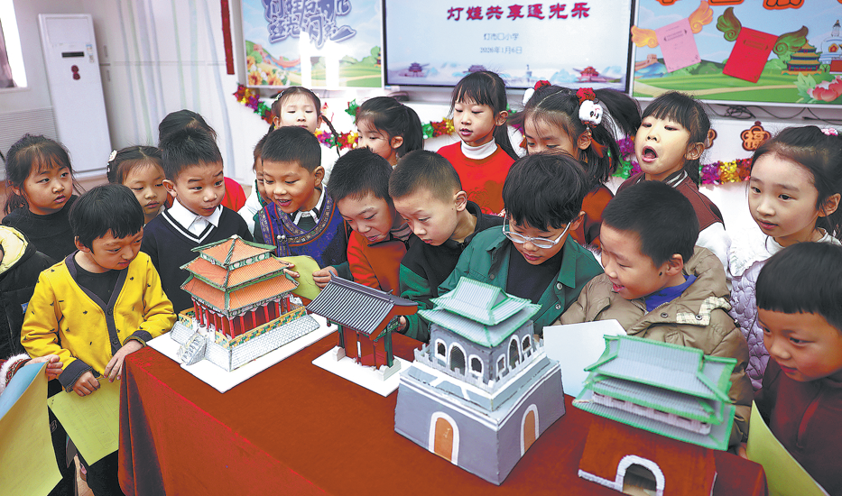 Students admire intricate models of ancient buildings during the "happy testing" day at a primary school in Beijing on Tuesday. Happy testing is a new type of paperless assessment designed for lower-grade primary school students. It replaces traditional written exams with gamified, contextualized challenge activities, aiming to reduce academic pressure on children.