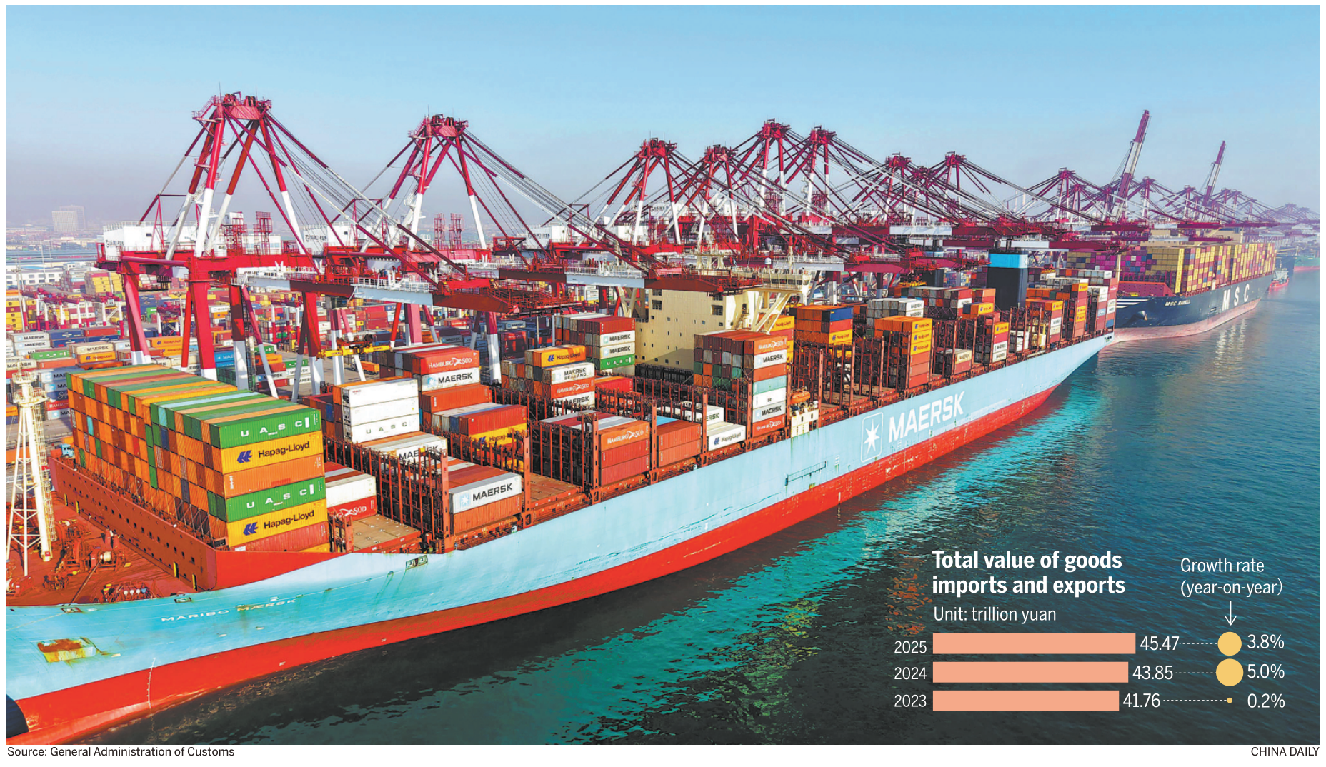 Their comments came after the General Administration of Customs said on Wednesday that China's total value of goods imports and exports hit a historic high of 45.47 trillion yuan ($6.5 trillion) in 2025, up 3.8 percent year-on-year.