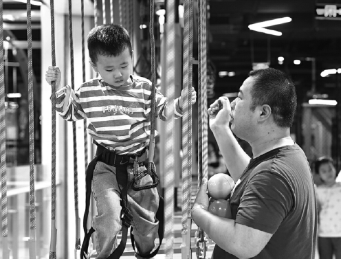 A boy tries a sports facility at an entertainment site in Hefei, Anhui province, during the National Day holiday.