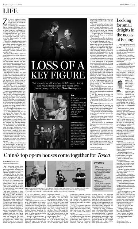 "It is very sad that my beloved teacher Zhu Yafen died about an hour ago. It's hard for me to believe it and I don't know how to express my grief," internationally celebrated pianist Lang Lang said in a post on microblogging platform, Sina Weibo, on Sunday. He studied with Zhu for six years.