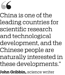 Impressed by the progress of science-related industries in China, Gribbin says that, "it is going from strength to strength", and that, "China is one of the leading countries for scientific research and technological development, and the Chinese people are naturally interested in these developments".