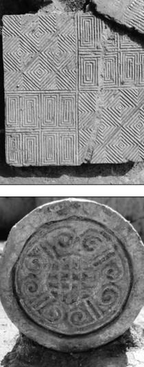 A brick (top) and a tile with decorative patterns are among structural components discovered at the site.