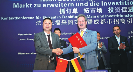 Representatives from the Chengdu Association of Medical Equipment Industry and the European Small and Medium-sized Enterprises Association sign an agreement at an investment promotion event in Frankfurt, Germany.
