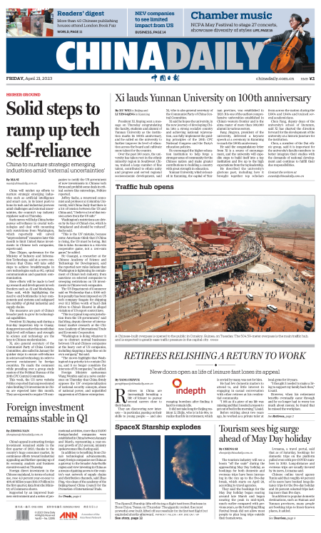 A Chinese-built overpass is opened to the public in Conakry, Guinea, on Tuesday. The 504.59-meter overpass is the main traffic hub, and is expected to greatly ease traffic pressure in the capital city.