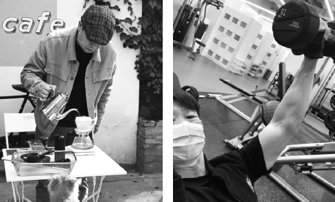 Left: Shen makes coffee at his cafe. Right: Li Zhijie builds his muscles at a gym in Beijing.
