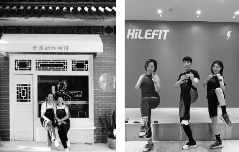 Left: Shen and his wife pose in front of the cafe he owns in Xianyang, Shaanxi province. Right: Li Zhijie (center) and his students pose for Body Combat, a high-energy workout inspired by martial arts.