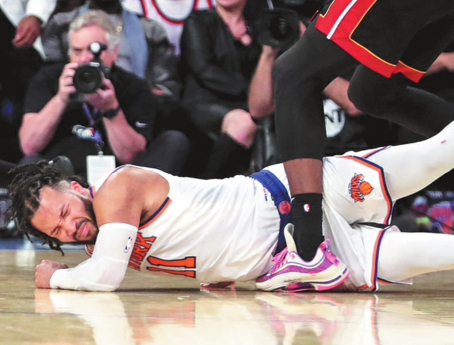 New York Knicks guard Jalen Brunson hits the deck after chasing a loose ball during Game 5 of the NBA playoffs Eastern Conference semifinal against the Miami Heat at Madison Square Garden in New York on Wednesday.