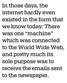 And in those days, the internet hardly even existed in the form that we know today: There was one "machine" (as we quaintly referred to that computer in those days) which was connected to the World Wide Web, and pretty much its sole purpose was to receive the emails sent to the newspaper.