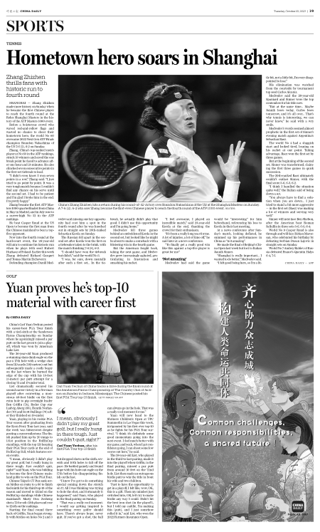 Zhang became the first ATP Masters 1000 quarterfinalist from China in May in Madrid, and in July rose to a career-high No 52 in the ATP rankings.