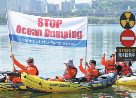 Environmentalists hold a rally on Wednesday in Seoul, South Korea, to condemn Japan's discharge of nuclear-contaminated water into the sea.