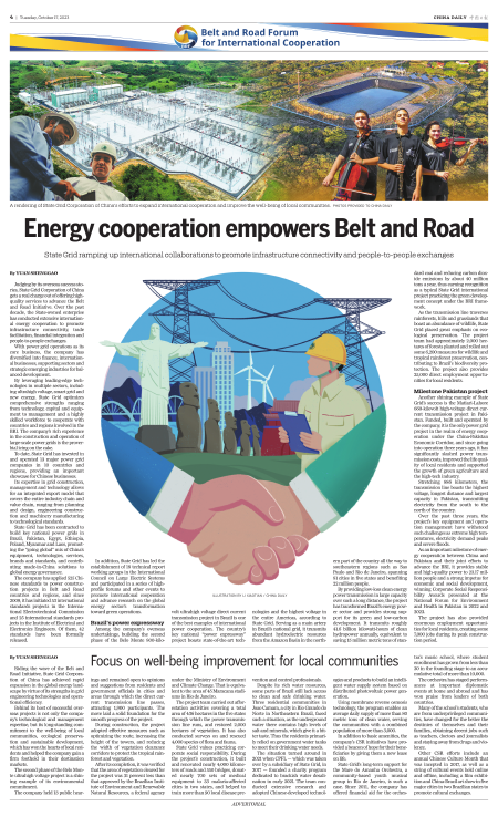 State Grid values practicing corporate social responsibility. During the project's construction, it built and renovated nearly 4,000 kilometers of roads and 550 bridges, donated nearly 700 sets of medical equipment to 33 malaria-affected cities in two states, and helped to train more than 90 local disease prevention and control professionals.