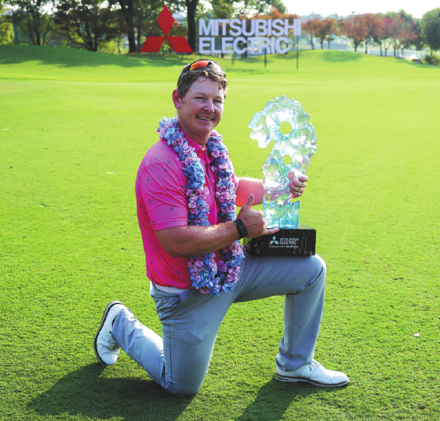 Kieran Muir of New Zealand poses with the trophy after winning the Mitsubishi Electric FA Golf Open by one stroke in Suzhou, Jiangsu province, on Sunday.