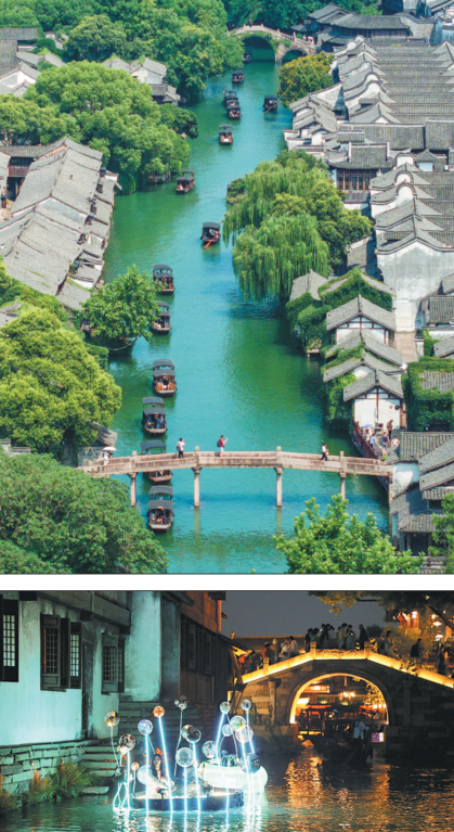 Top: A bird's-eye view of the water town of Wuzhen in Zhejiang province. Above: A boat with installations from the China Academy of Art in Hangzhou, Zhejiang province.