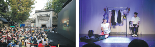 From left: Audience members gather outside Wuzhen's West Warehouse Theater to watch a live broadcast of On Her Own. The cast of Exit, winner of the Best Play award, perform at this year's emerging theater artists' competition.