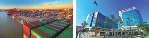 From left: An elevated view of Xiamen Port, a transportation hub of the Maritime Silk Road and a high-profile platform set up by Fujian province to serve the BRI.Xiamen Cross-border E-commerce Industrial Park, which acts as a key measure to boost free trade in the city.