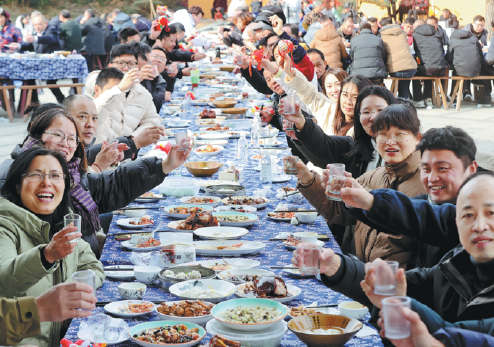 Tourists and villagers raise a toast on Tuesday during a fish-themed banquet in Dongheng village in Huzhou, Zhejiang province.