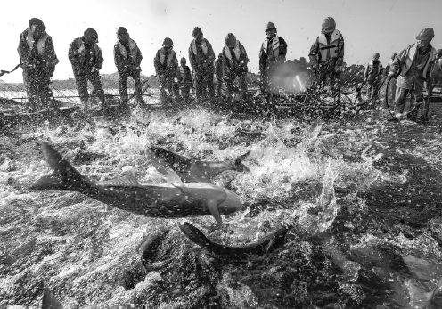 Fishermen haul a large net to harvest fish on Xiannyu lake in Xinyu, Jiangxi province, on Friday. Abundant in fishery resources, the local community has implemented a unique fishing method over the years using large nets to catch mature fish while releasing the smaller ones, which ensures the sustainable development of the fishery ecosystem.