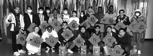 Professor Liu Hongli and international students at a Spring Festival calligraphy event at Beijing University of Technology in January 2023.
