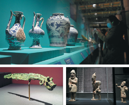 Top: Exhibited blue-and-white porcelain demonstrates cultural exchanges between China and West Asia during ancient times. Left: A Shang Dynasty (c.16th century-11th century BC) bronze dagger inlaid with turquoise eyes reflects early-stage communications between China and West Asia. Right: Pottery figurines showing caravans on the ancient Silk Road.
