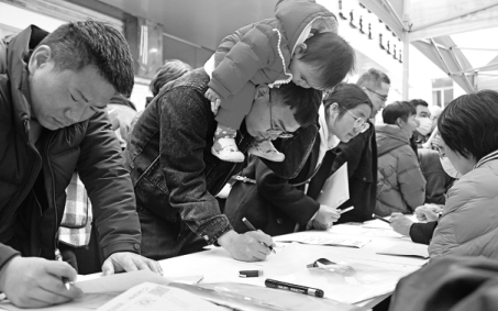 Job seekers, including a father with his baby, register for work positions at a job fair held in Taizhou, East China's Zhejiang province, on Thursday.