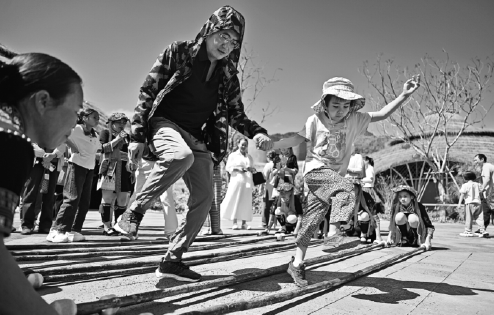 Tourists experience the local bamboo dance with residents of Maona village, Hainan province, on Wednesday, in celebration of Spring Festival.