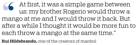 "At first, it was a simple game between us: my brother Rogerio would throw a mango at me and I would throw it back. But after a while I thought it would be more fun to each throw a mango at the same time," Rui Hildebrando, 44, told AFP.