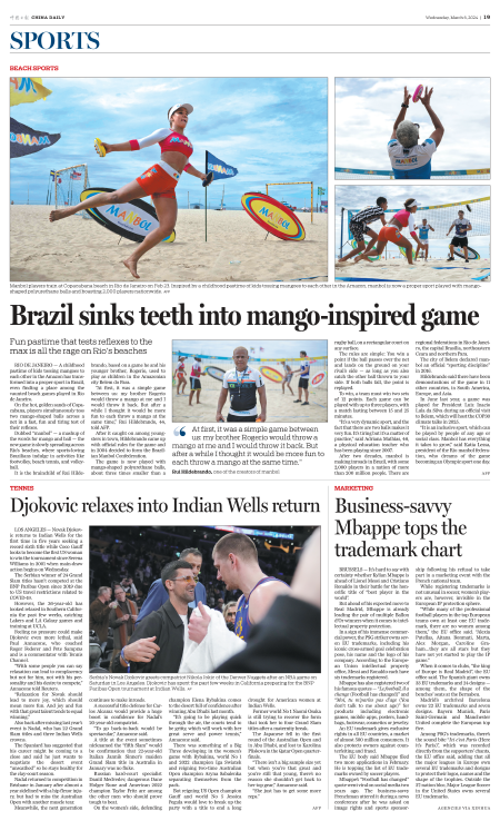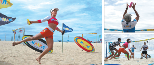 Manbol players train at Copacabana beach in Rio de Janeiro on Feb 23. Inspired by a childhood pastime of kids tossing mangoes to each other in the Amazon, manbol is now a proper sport played with mango-shaped polyurethane balls and boasting 2,000 players nationwide.
