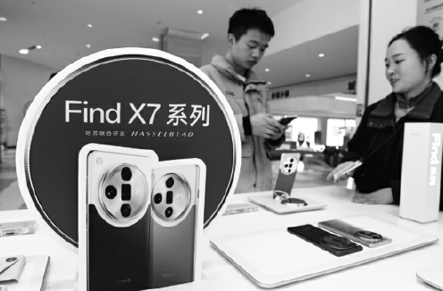 A saleswoman addresses consumer queries on Oppo Find X7 smartphones at a store in Shanghai in January.