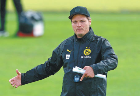 Borussia Dortmund coach Edin Terzic gestures to players during a training session ahead of Saturday's Champions League final at the team's training center in Dortmund, Germany, on Tuesday.