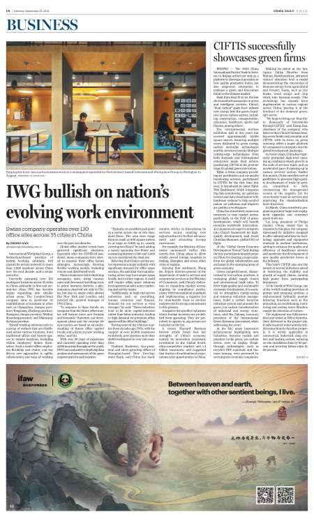 International Workplace Group, a Switzerland-based provider of hybrid working solutions, will expand its service network to more than 2,000 locations across China over the next decade, said a senior executive.