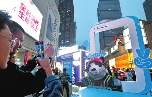 The iconic climbing panda sculpture in downtown Chengdu, dressed up in a firefighter's attire as part of the ongoing fire safety awareness campaign, attracts visitors in Sichuan province on Friday. Sichuan launched its fire safety awareness month to mark the 33rd National Firefighting Day that falls on Saturday this year.