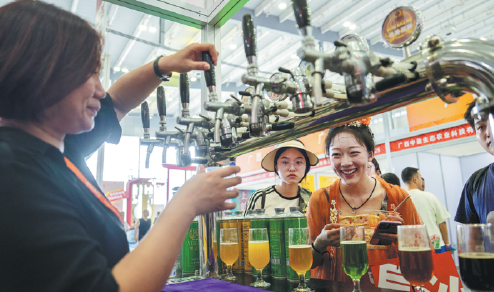 Visitors wait to taste beer at a food service exhibition in Changsha, Hunan province, in September.
