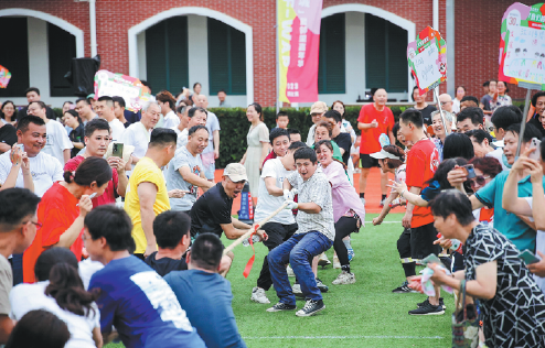 Residents of Shanghai Kangcheng community attend a tug-of-war event organized by the neighborhood in July, 2023.