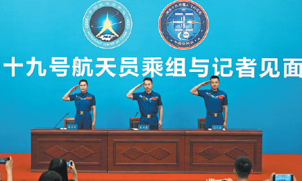 Shenzhou XIX crew members Wang Haoze (from left), Cai Xuzhe and Song Lingdong make their first public appearance in Beijing Wednesday after returning from space in April.