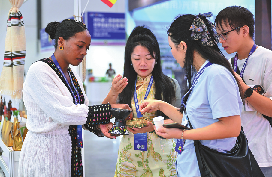 An exhibitor introduces Ethiopian coffee beans to delegates visiting the 3rd Hainan International Tropical Food Supply Chain Expo held in Haikou, capital of Hainan province, from Thursday to Saturday.