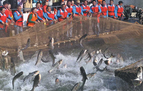 Fish leap out of water as fishermen tighten the net during a fish-catching activity in Lushan, Jiangxi province, on Saturday.